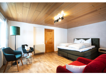 Unsere Junior Suite Alpenrebe verfügt über ein Schlafzimmer mit getrenntem sehr gemütlichen Wohnraum, es ist eine große Ausziehcouch im Wohnraum - Platz für eine dritte erwachsene Person oder 2 Kinder, Sat-TV, Badezimmer mit Dusche/WC, Fön, kleiner Kühlschrank, Parkettboden, große Sonnenterrasse mit Liegestühlen und Gartenmöbeln, herrlicher Blick auf die umliegenden Berge. Das Zimmer ist sehr gemütlich ausgestattet mit viel Zirbenholz.